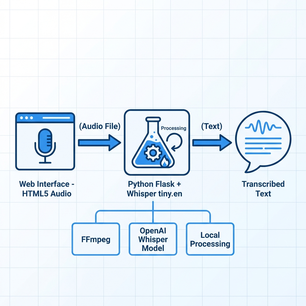 Designed a clean three-tier architecture: vanilla JavaScript frontend for audio capture and UI interactions, Python Flask server handling HTTP endpoints and Whisper inference, and FFmpeg subprocess for audio format conversion. The /transcribe endpoint accepts multi-format audio (WebM, WAV, MP3, M4A), auto-converts if needed, and returns JSON transcription.